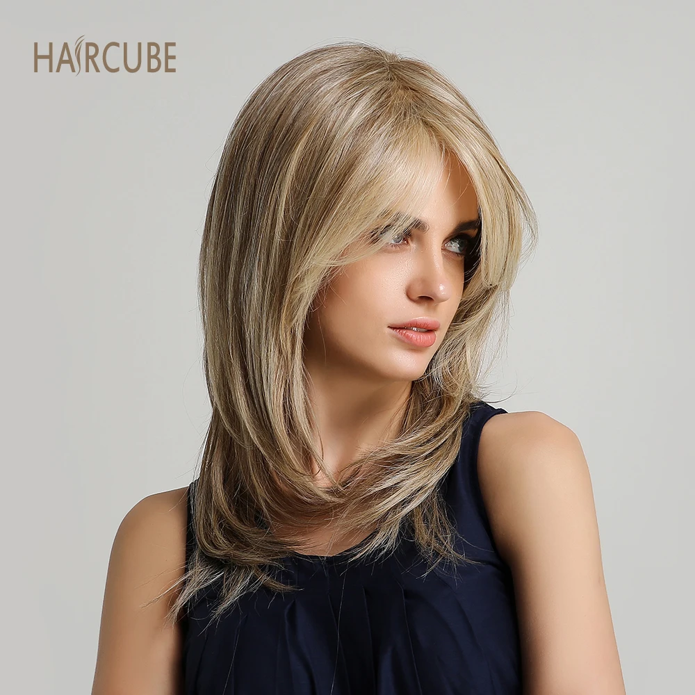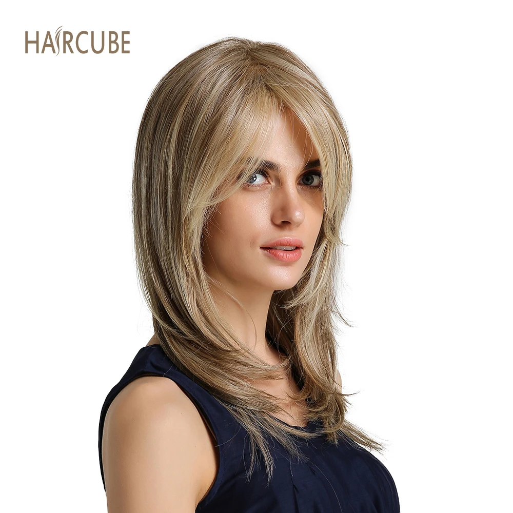 HIGH QUALITY Haircube 16 Inch Natural Wave Synthetic Wig with Bangs Light Brown Mixed Color Cospaly Costume Wome