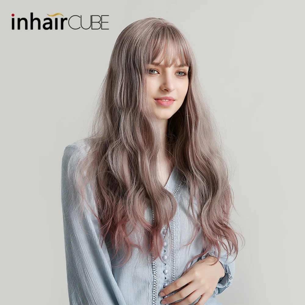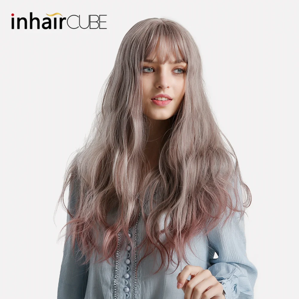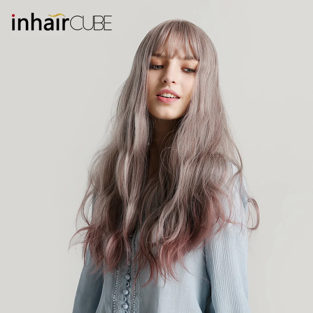 Hot Sale Inhaircube Lolita Wig with Bangs Ombre Grey Purple Long Water Wave Womens Synthetic Hair Half Wigs