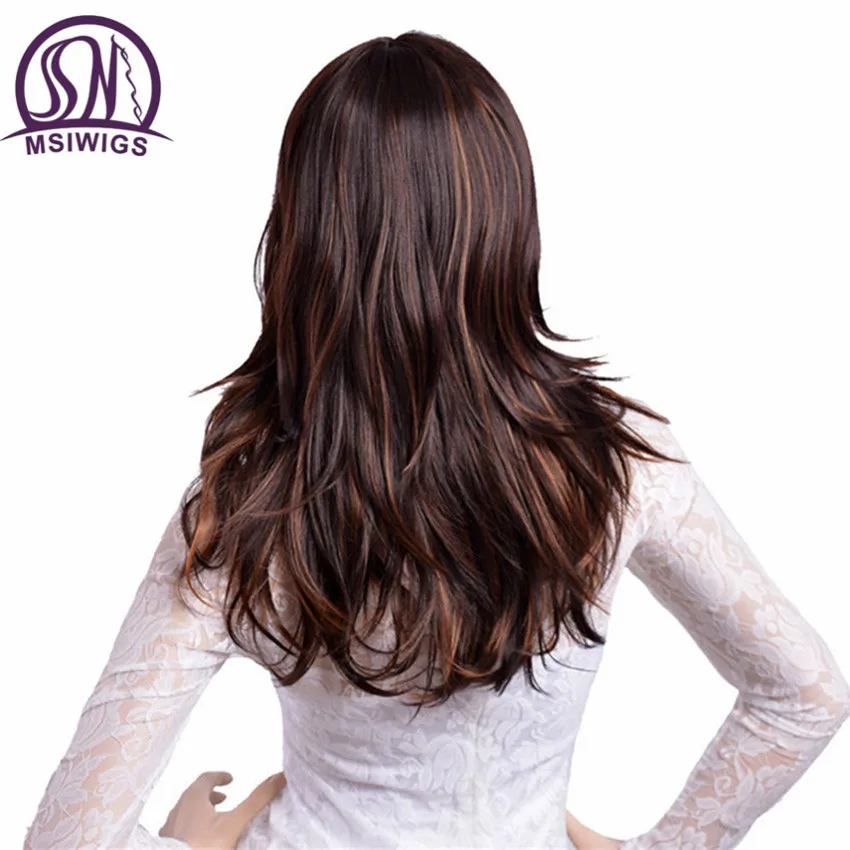ORIGINAL MSIWIGS Long Straight Hair Synthetic Wigs Brown with Yellow Highlights Ombre Wig for Women High Tem